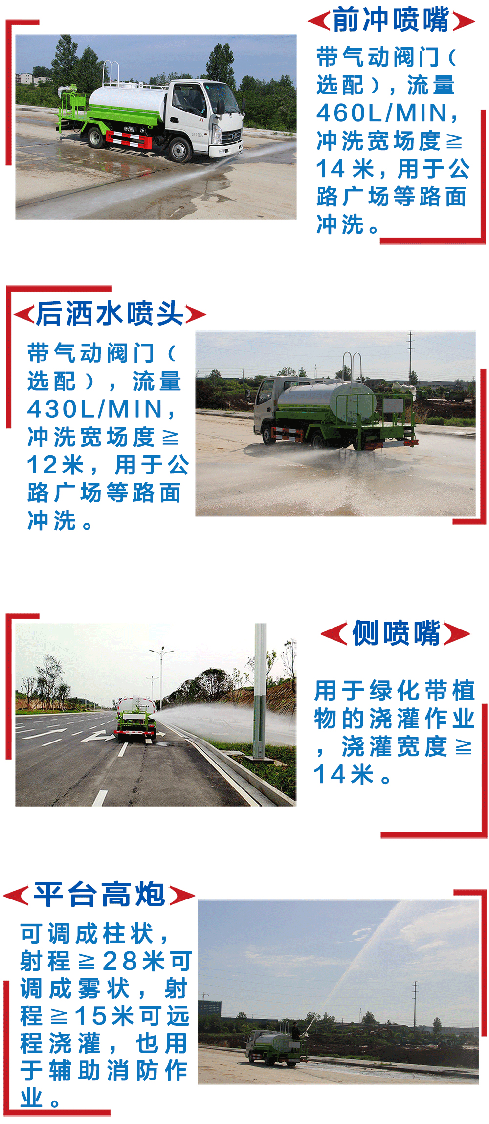 其他 | 随底盘选装驾驶室前脸样式,扩展后部结构样式,仅采用4500mm轴距,有效容积:11.34立方米,罐体外形尺寸(长×长轴×短轴)(mm)为:5200×2300×1420,5200×2300×1410;主要装置为水罐,洒水泵,主要用于城市洒水、压尘; ABS型号为CM4XL-4S/4M,生产厂家为广州瑞立科密汽车电子股份有限公司.;侧面防护装置材料材质:Q235,连接方式:螺栓连接;后下部防护装置材料材质:Q235,连接方式:螺栓连接,断面尺寸(宽×高):50×120(mm),离地高度:460mm. | ||